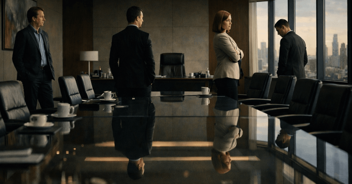 Frank, Gerri, Karolina, Karl, and Hugo demonstrate the boardroom corollary to the Roy dynamic: when thrones wobble, even disciplined professionals scramble for the nearest stable handhold. No one is above the pull.