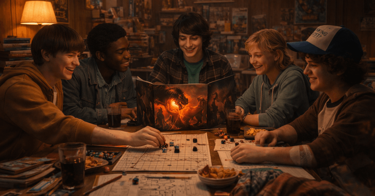 Back-to-basement framing validates the storytelling engine that powered the series. Friends gather, roll dice, and imagine solutions together, which mirrors how they survive every season.